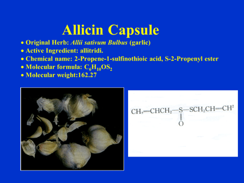 In 1980s the hospital made garlic preparations became formal medicine “Allicin Injection” in China and produced by pharmaceutical factory. It was in solution form. I redesigned it and made it to be enterically coated and time-release capsule to enable it becoming a food supplement and can be dosing easily.